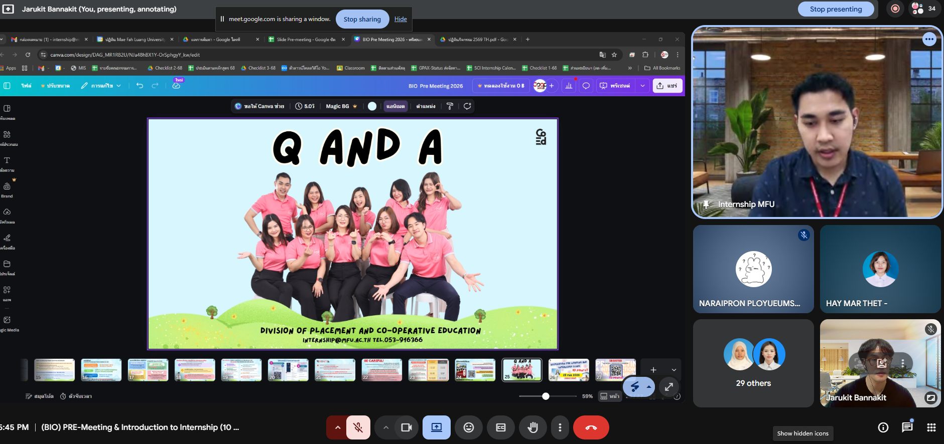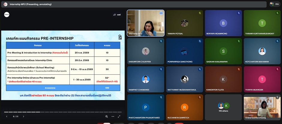 The Division of Placement and Cooperative Education organized a Pre-Meeting & Introduction to Internship for students from the Business Administration Program (Service Business Management), School of Management; English Program, School of Liberal Arts; Law Program, School of Law; and Biological Sciences Program, School of Science. The session introduced the Internship team and staff supporting each program, shared updates on upcoming internship activities, and provided an overview of Cooperative Education and internship courses, including tips on selecting suitable organizations and how to use the internship organization database to prepare for real-world work experience.