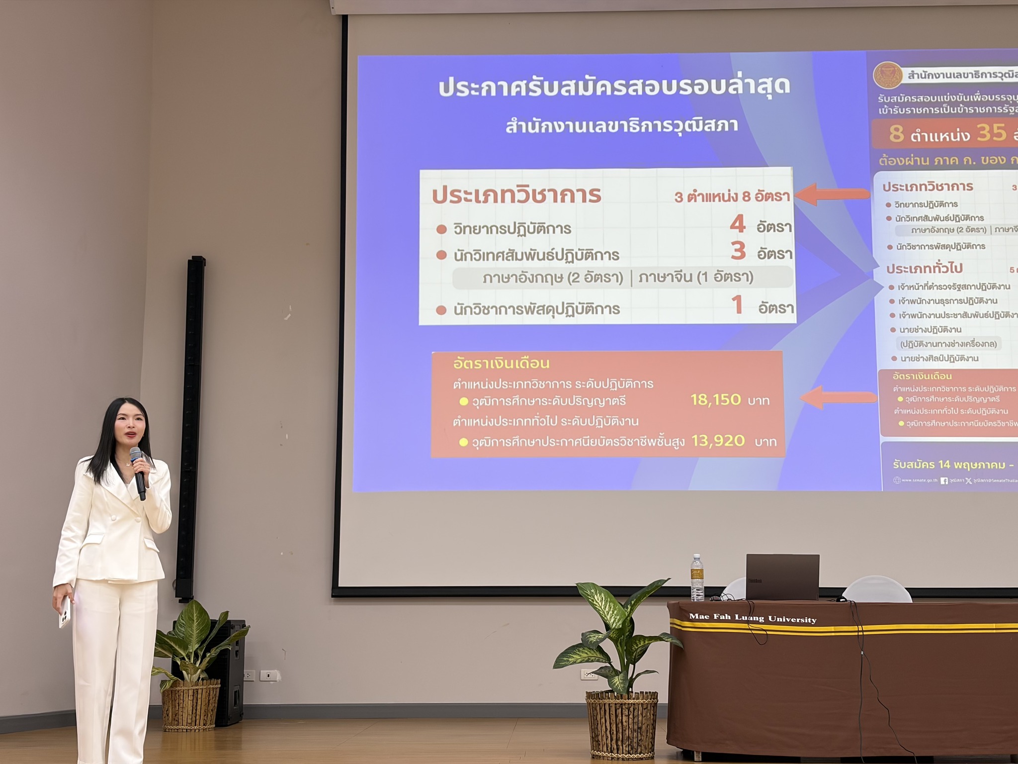 On 28 March 2025, the Division of Placement and Cooperative Education, in collaboration with the School of Sinology (Business Chinese Program, Chinese Language and Culture Program, and Chinese Studies Program), held the “School Meets Students” activity at Pradu Daeng 2 Conference Room to prepare students before starting their internships. The session introduced guidelines on selecting suitable internship organizations and provided advice on preparing for internship placements.The activity also featured experience-sharing sessions delivered by the guest speakers: Ms. Jenjira Aeng, International Relations Officer (Professional Level), Chinese and Other Languages Section, Foreign Languages Bureau, Secretariat of the Senate; and Mr. Kanisorn Thawongsa, Supplier Technical Assistance Specialist at Changan Auto Southeast Asia Co., Ltd., who shared their real-world professional experiences with the students.