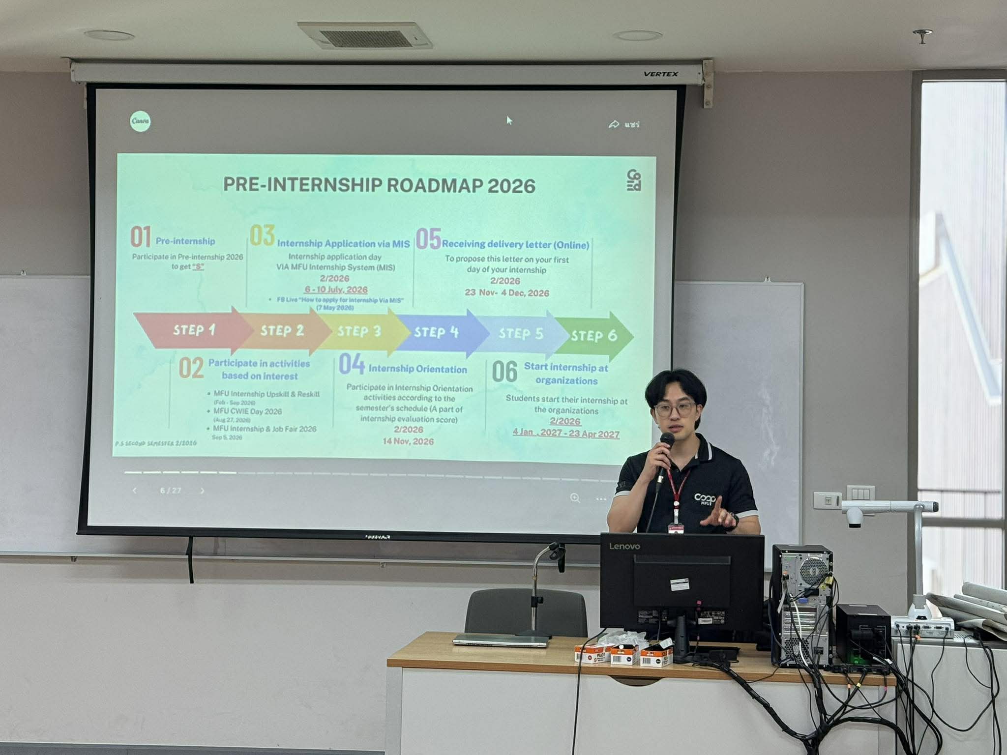 The Division of Placement and Cooperative Education organized a Pre-Meeting & Introduction to Internship at Room E4A-708 for students from the Environmental Health Program, School of Health Sciences. The session introduced the Internship team and staff supporting each program, shared updates on upcoming internship activities, and provided an overview of Cooperative Education and internship courses, including tips on selecting suitable organizations and how to use the internship organization database to prepare for real-world work experience.